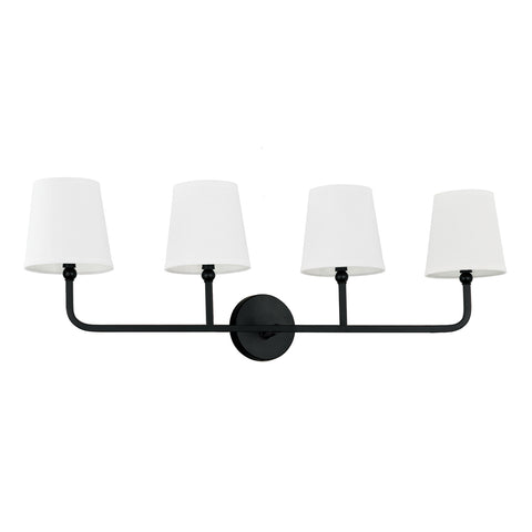 THE DAWSON SCONCE STANDS OUT WITH A WHITE, TAPERED FABRIC SHADE TOPPING OFF A CURVED ARM.