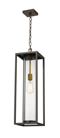 FEATURING AN AIRY RECTANGULAR ALUMINUM FRAME AS WELL AS A SINGLE DROP DOWN LIGHT, IN A WEATHER-RESISTANT OUTDOOR BRASS FINISH AND SHEATHED WITHIN A CLEAR CYLINDRICAL GLASS GLOBE, THIS SCONCE ADDS JUST THE RIGHT AMOUNT OF GLOW.