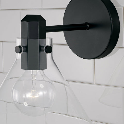 THE FACETED SOCKET AND RIVET DETAILS IN MATTE BLACK ADDS A POP OF PERSONALITY TO THE TAPERED GLASS.