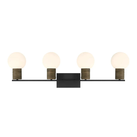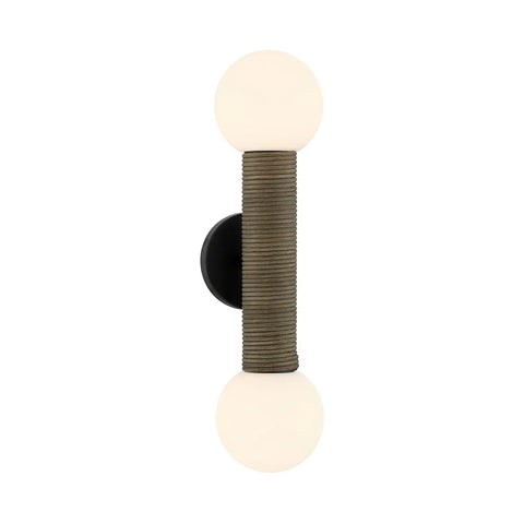 DARK RATTAN ACCENTS WRAP AROUND ORBS OF WHITE OPAL GLASS, CREATING SOFT TEXTURE THAT STANDS OUT BEAUTIFULLY AGAINST THE MATTE BLACK FINISH.