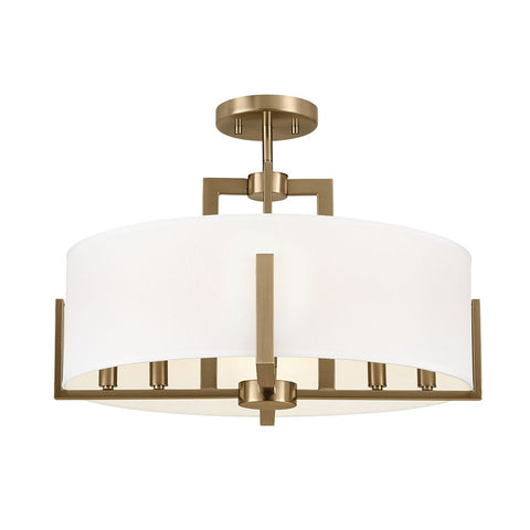 ITS FABRIC SHADE NESTLES INTO ON-TREND CHAMPAGNE BRONZE METAL UPRIGHTS.