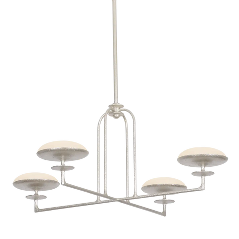 A HANDCRAFTED WARM SILVER LEAF FINISH ADDS TEXTURE TO THE GEOMETRIC SHAPES, ARCHITECTURAL ARCHES, AND DECORATIVE BOBECHES WHILE THE ETCHED MATTE GLASS SHADES PROVIDE A SOFT DIFFUSION OF LIGHT.
