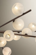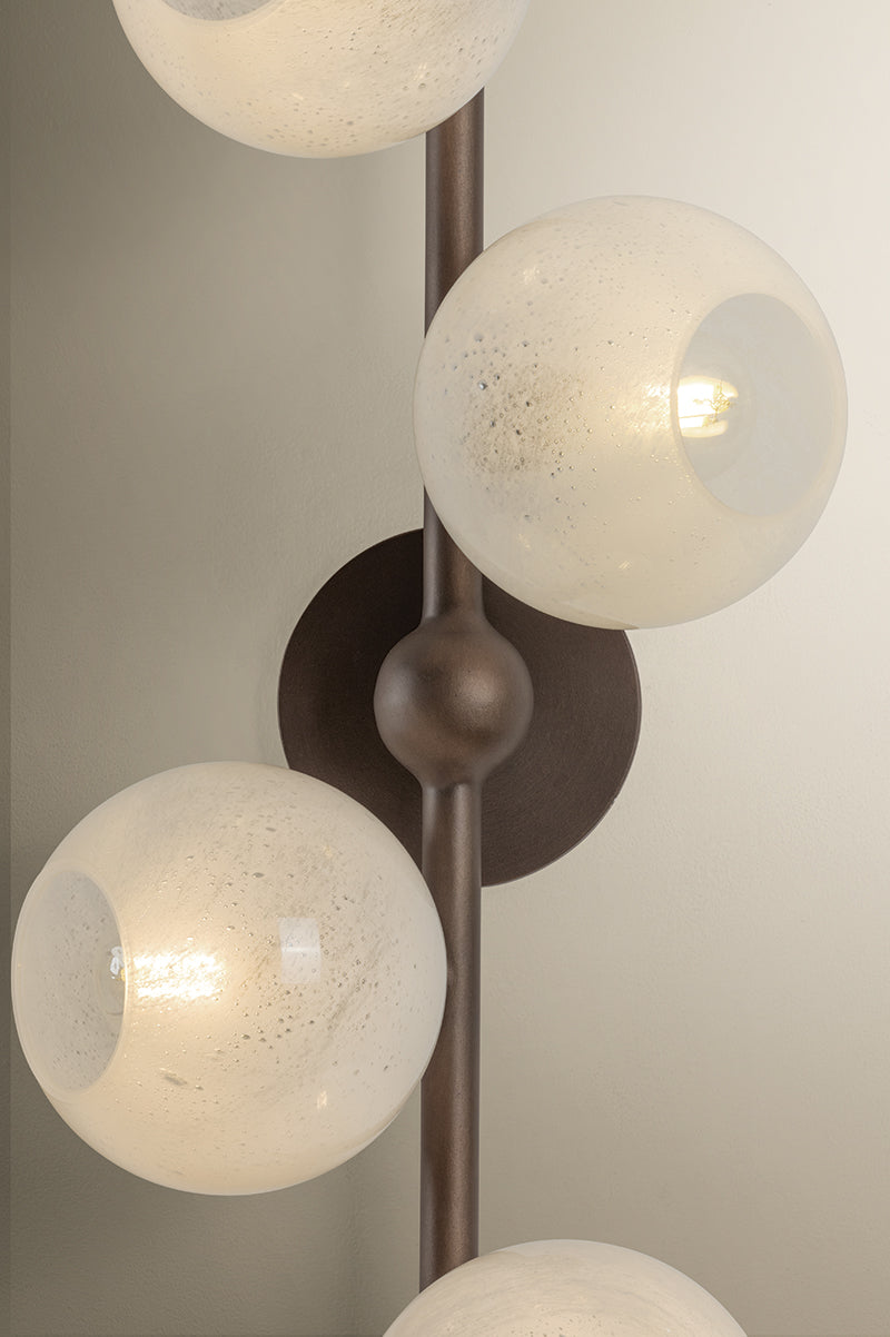 FINISHED IN BRONZE LEAF, SLENDER ARMS EXTEND OUTWARD, CULMINATING IN A SOFTLY GLOWING CLOUD SEEDY GLASS GLOBE.